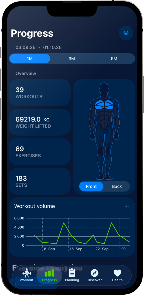 Visualize your progress and see how much each muscle group is being used with the muscle-heatmap. Identify weak spots to create a more balanced workout.